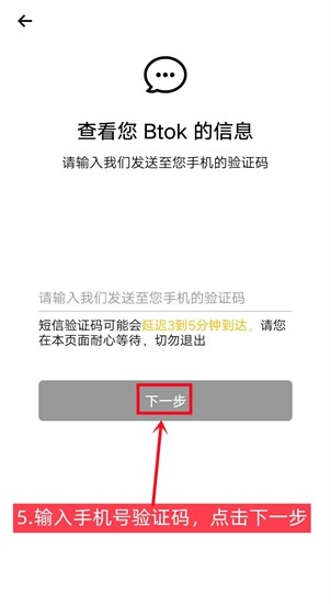 5. 输入您手机收到的验证码,准确填写后点击下一步。验证码用于确认手机号所有权,确保账户真实可靠。如果您未收到验证码,请检查短信或稍后重试,避免频繁操作导致延迟。