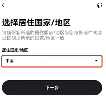 2、在验证通过后,页面会提示您选择【居住国家/地区】。请根据您的实际情况从下拉列表中选择合适的选项,这一步是为了符合不同地区的法规要求,并优化平台服务。选择完成后,点击【确认】按钮继续。正确的国家/地区信息有助于平台为您提供本地化支持,确保交易过程顺畅无阻。