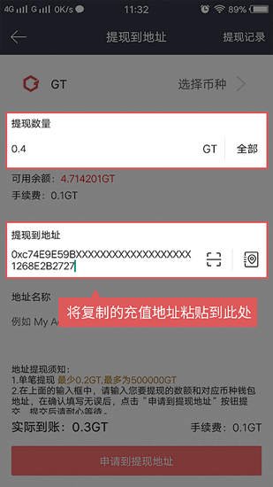 4. 在提现页面中,将之前复制的充值地址粘贴到指定位置。确保地址无误后,输入您要提现的数量,然后点击“申请到提现地址”按钮继续操作。