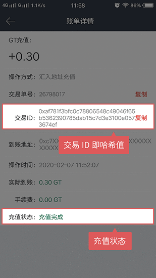 2. 点击“充值”按钮后,选择“汇入充值地址”功能。这时,您可以查看GT的充值地址信息,点击“复制”按钮将地址保存到剪贴板。