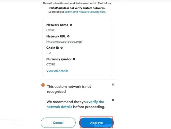 5、返回小狐狸钱包界面,系统会弹出确认提示。点击“批准”按钮,完成网络添加操作。执行以上步骤后,Core链将正式集成到您的钱包中。下次打开网络选择器时,您可以直接在列表中找到并切换至核心网络。这标志着添加过程成功结束,您可以开始使用Core链进行交易或存储。