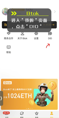 1、进入我的页面点击DID。在btok应用中,首先确保您已登录账户。打开应用后,导航至底部菜单栏的“我的”页面,这里集中了个人设置和账户管理选项。找到并点击“DID”入口,这一步是访问身份管理功能的基础。操作时注意网络连接稳定,避免因延迟导致页面加载失败。