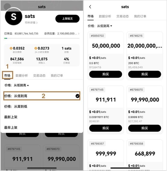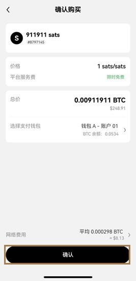 接下来,仔细评估市场中的挂单。查看每个挂单的价格区间和可用数量,选择与您预算和需求相匹配的选项。价格通常会根据市场供需波动,因此建议在交易前观察一段时间以找到合适时机。数量方面,确保您购买的代币量符合您的投资计划。选定挂单后,点击【购买】按钮进入接单界面。在这一步,系统会显示该交易的预估手续费和总成本,手续费基于比特币网络当前拥堵情况计算,可能有所变化。