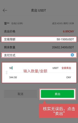 3. 输入您要出售的USDT数量或金额。在输入框中填写后,点击“卖出”按钮确认。建议先估算金额以避免输入错误,系统会自动计算实收款。完成输入后,请检查数据准确性再继续。