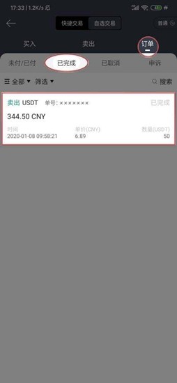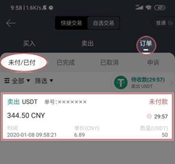 6. 卖单生成后,前往“订单”菜单下的“未付/已付”选项查看当前订单。这里会显示交易进度,您可以随时监控。点击订单可获取更多详情。