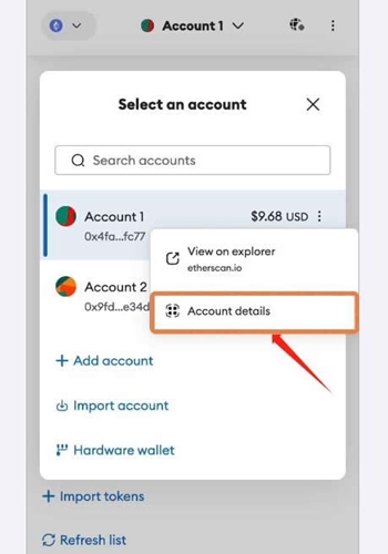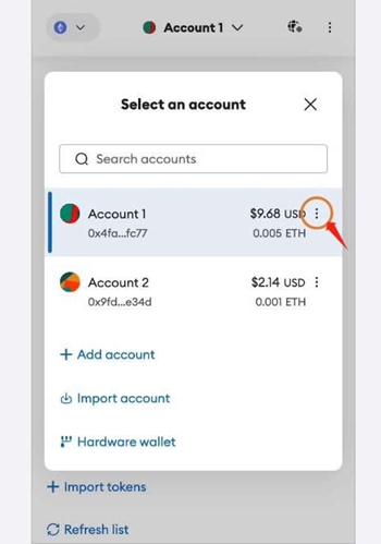 2、第二步:单击要导出的帐户旁边的三个垂直点。这些点代表更多操作菜单,位于每个账户条目的右侧。点击后会弹出选项列表,包括账户管理功能,为后续步骤做准备。