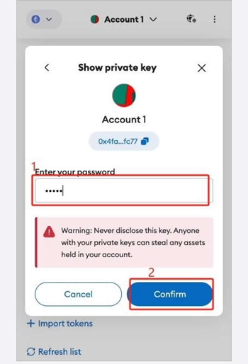 4、第四步:输入您的钱包密码并点击“确认”。密码验证是安全措施的关键环节,确保只有授权用户能访问私钥。输入正确密码后,点击“确认”继续,系统会解锁私钥显示功能。