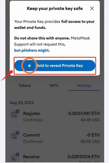 5、第五步:单击并按住“按住以显示私钥”以显示您的私钥。这个交互设计防止误操作,您需要长按按钮几秒钟,私钥会以明文形式出现。这是一个关键步骤,请确保在安全环境下操作。