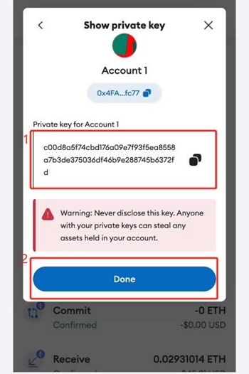 6、第六步:单击将私钥复制到剪贴板。确保将其保存在安全的地方。单击“完成”关闭屏幕。复制后,私钥会暂存到设备剪贴板,您可以粘贴到加密文档或硬件存储中。完成后点击“完成”退出页面,整个过程结束。