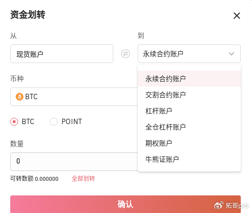2. 在弹出的划转框选择永续合约账户,输入要划转的比特币(或USDT)金额并【确认】:选择永续合约账户后,系统会弹出划转窗口,您需输入比特币或USDT的具体金额。这一步是合约交易的基础,永续合约账户支持灵活的交易策略,而输入金额时务必核对数字准确性,避免误操作。芝麻交易所提供实时提示功能,帮助用户确认输入无误后点击确认按钮。完成划转后,资金将立即转入合约账户,为交易做好准备。提醒用户根据市场波动调整金额,以管理潜在风险。