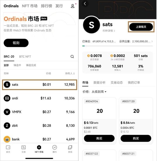 1. 在Ordinals市场中BRC-20列表中选择目标代币,进入详情页面并点击【上架铭文】按钮。首先,您需要登录OKX平台并导航到Ordinals市场部分。浏览BRC-20代币列表,仔细选择您想交易的特定代币,确保其符合您的投资策略。点击进入代币详情页面后,找到【上架铭文】选项并点击,这将启动上架流程的初始阶段。