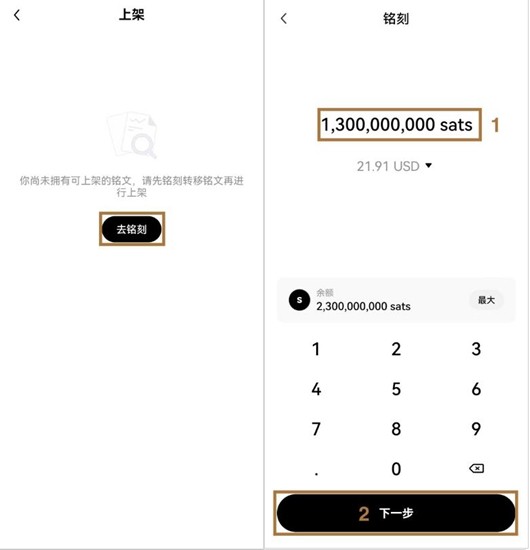 2. 上架前必须铭刻一个Transfer铭文,点击【去铭刻】输入数量后签名【确认】操作。Transfer铭文是上架的必要前提,它代表代币所有权的转移准备。点击【去铭刻】后,在弹出窗口中输入您计划铭刻的代币数量,建议根据市场供需合理设置以避免浪费。完成后通过数字签名进行【确认】,这一步确保交易的安全性和真实性。