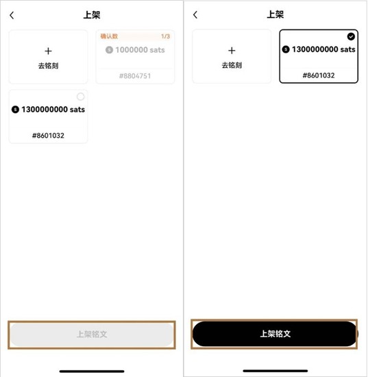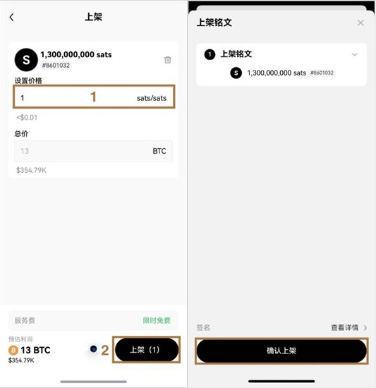 4. 区块确认完成后选择铭文点击【上架铭文】,输入价格点击【上架】并【确认上架】结束。一旦区块确认成功返回Ordinals界面,从您的铭文列表中选择刚完成的Transfer铭文。点击【上架铭文】后输入您期望的出售价格,建议参考市场行情设置合理值以吸引买家。点击【上架】按钮预览信息无误后,进行最终的【确认上架】操作,至此您的代币正式上市交易。