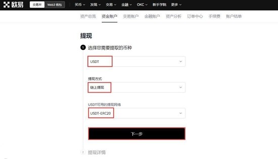 7. 币种选择【USDT】,提现方式选【链上提现】,提现网络选【USDT-ERC20】。USDT-ERC20链提现手续费较高但安全性强,适合大额转账;小额转账可考虑其他链如TRC20以节省费用。