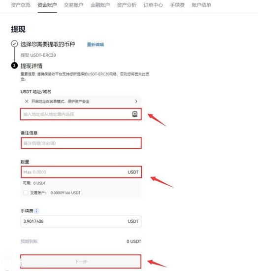 8. 输入接收方的USDT地址,填写转账数量,然后点击下一步。某些币种需额外填写标签(如XRP),标签通常是数字串,忽略它可能导致资产丢失。务必核对地址多次避免错误。