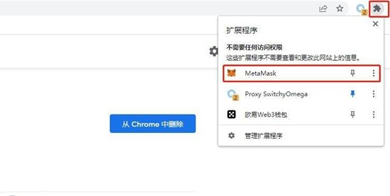 4、点击浏览器右上角的小狐狸头像图标,在弹出的菜单中选择“拓展程序”并开启它。这样 Mask图标就会固定在工具栏上,方便您随时访问和使用钱包功能。