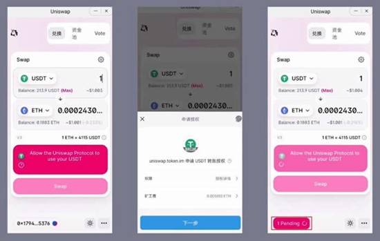 3、如果这是您首次交易某个代币,Uniswap会要求您进行授权操作。以USDT兑换ETH为例,页面会显示“Allow the Uniswap Protocol to use your USDT”的提示按钮,点击它启动授权流程。授权是为了确保协议能安全访问您的代币,点击“下一步”确认后,页面左下角将显示“Pending”状态,表示交易正在处理中。此过程可能需要几分钟,请耐心等待网络确认。